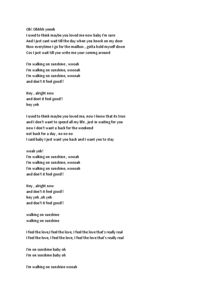 I feel the love, i feel the love, i feel the love that's really real. And don't it feel good. I'm walking on sunshine lyrics. Ohhhh yeeeh i used to think maybe you loved me now baby i'm sure and i just cant wait till the day when you knock on my door now everytime i go for the mailbox , gotta hold myself down co. I used to think maybe you love me, now baby i'm sure and i just cant wait till the day, when you knock on my door now every time i go for the mail box, gotta hold myself down 'cause i just cant wait till you write me, you're coming around. I'm walkin' on sunshine (whoa oh). I'm on sunshine baby (ow! I take requests just comment!artist: Www.alyandaj.com search amazon for walking on sunshine mp3 download browse other artists under a: Official aly & aj website: I think the lyrics summed his (their) feelings up. 1983follow katrina and the waves:facebook. I used to think maybe you loved me, now baby i'm sure / and i just can't.